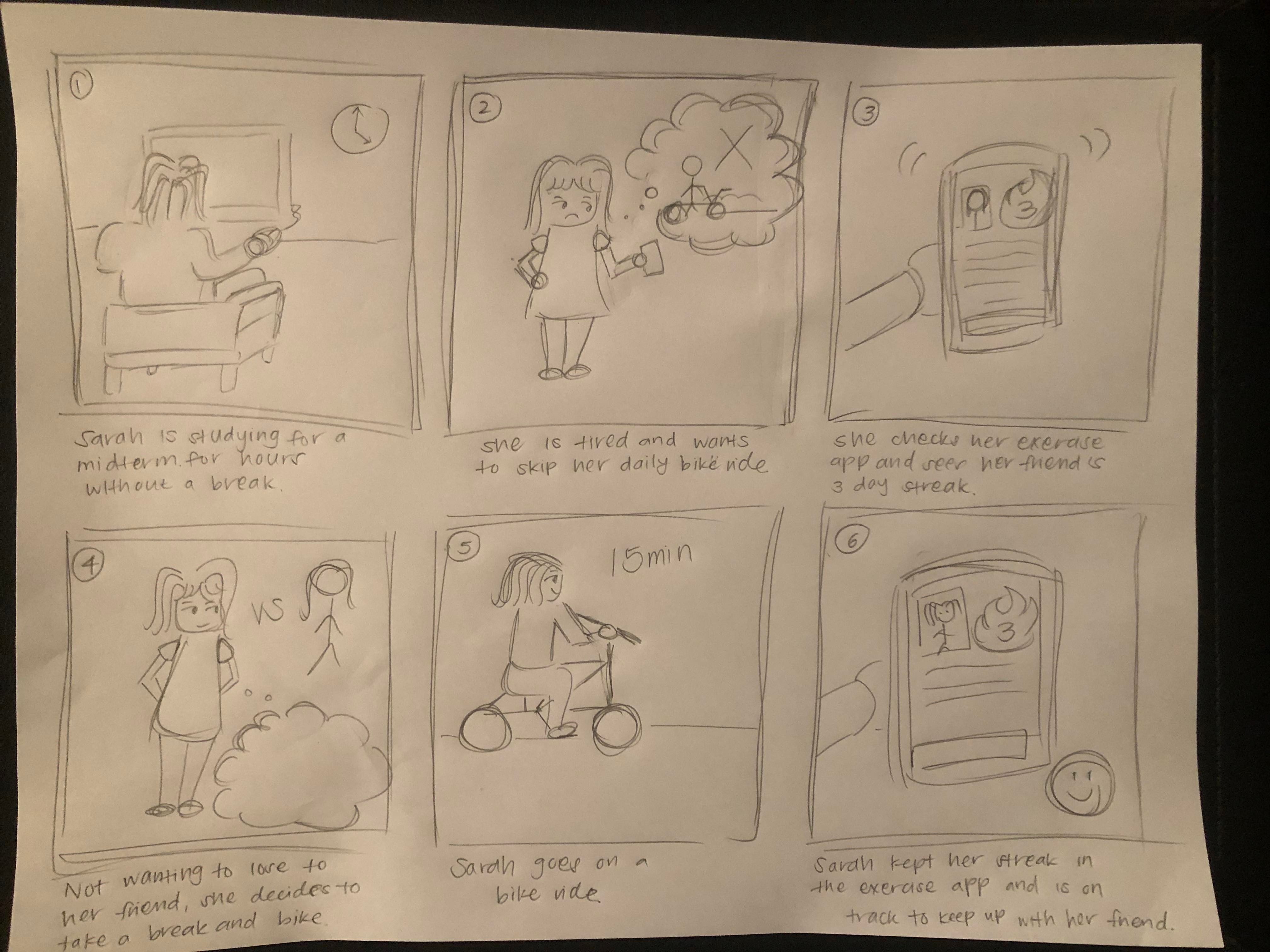 This storyboard describes a person (Sarah) who has been studying for hours for her midterm with no break. She usually bikes everyday but feels tired and wants to skip a day. She checks our app and sees that her friend has a three day exercise streak. Not wanting to lose to her friend, Sarah decides to take a break and bike for 15 minutes. She earns her own three day streak and is happy about her accomplishments.